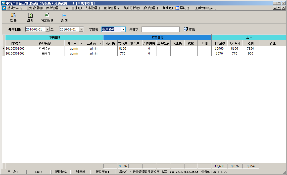 中異廣告公司管理軟件(綜合版)在企業(yè)版之上增加了,客戶聯(lián)系記錄、預(yù)約、生日管理,員工工資及人事管理,通知中心和企業(yè)公告及各種提醒功能